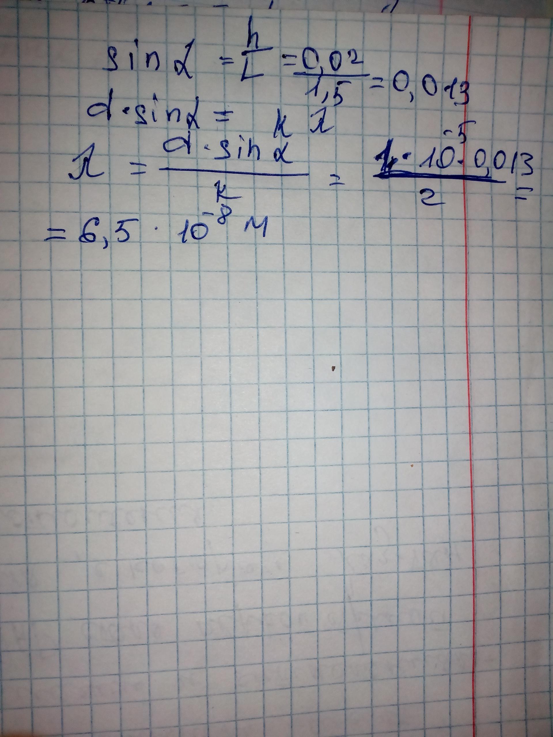 рассчитать длину волны излучаемого света, если расстояние между полосами второго порядка 2 см, расстояние от решетки до экрана 1,5 м. Угол, под которым падают лучи максимальный (180⁰). Период дифракционной решетки 1∙10^-5 м