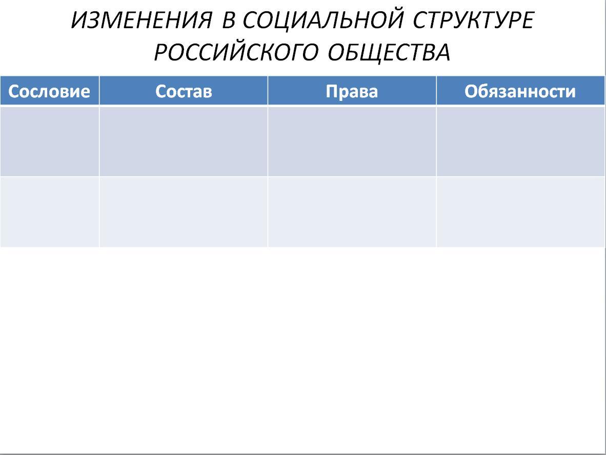 История 7 класс таблица "ИЗМЕНЕНИЯ В СОЦИАЛЬНОЙ СТРУКТУРЕ РОССИЙСКОГО ОБЩЕСТВА "
