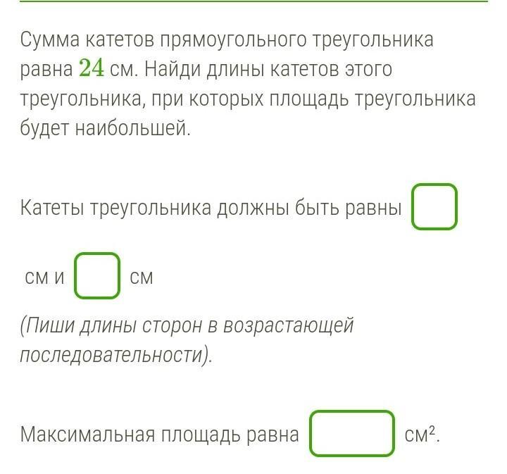 Ответ: 12 см и 12 см - катеты; 72 см^2 - площадь