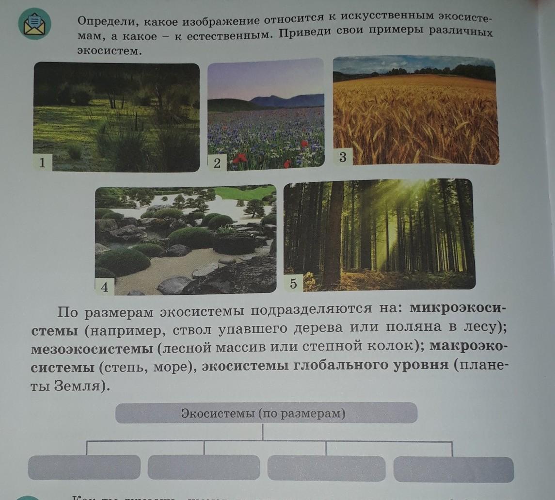 Определи, Какие изображения относятся к искусственным экосистемам, а какое к - естественным. Приведи свои примеры различных экосистем!
