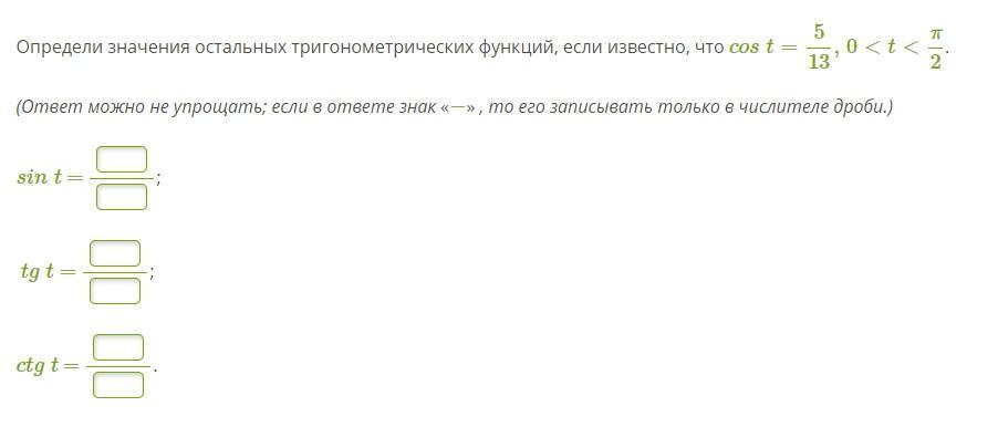 Определи значения остальных тригонометрических функций, если известно, что cost=513,0