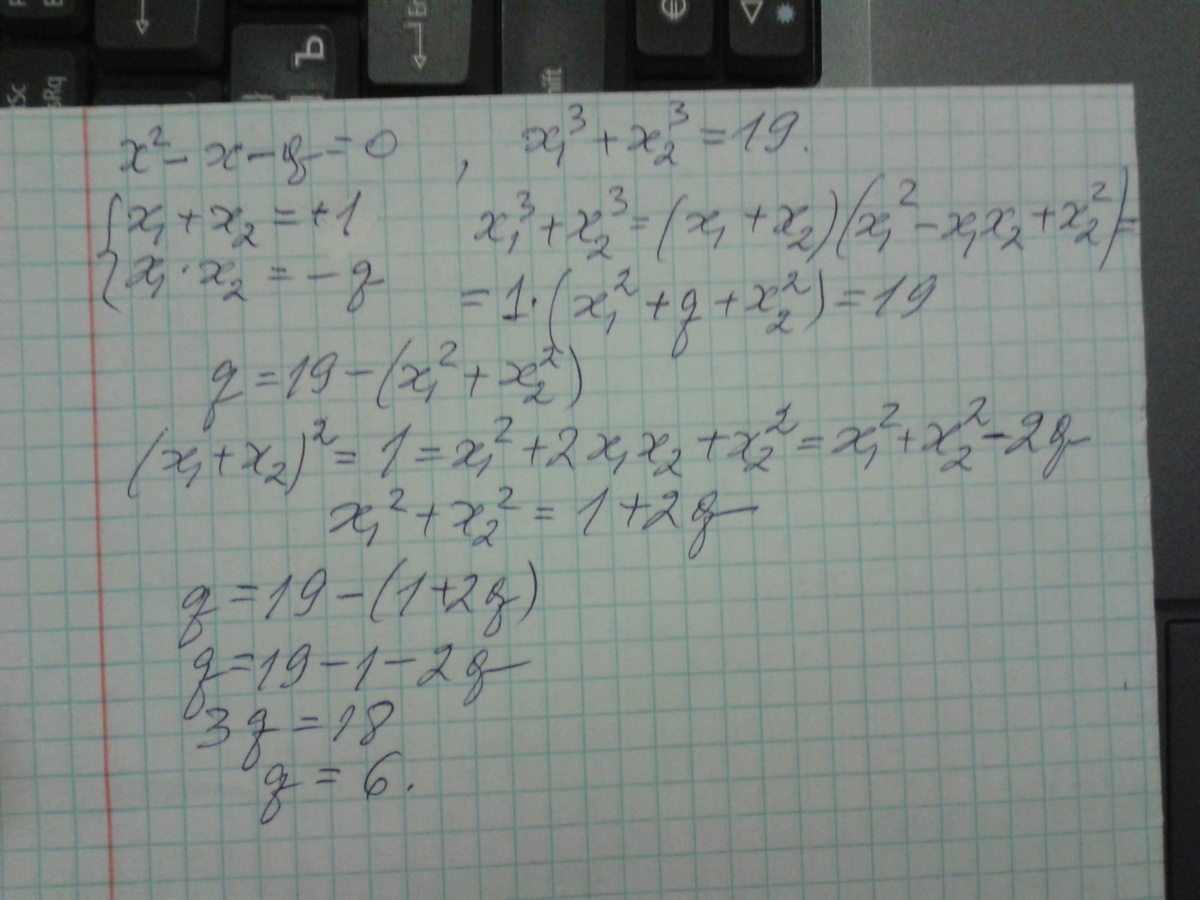 3.при каком значении q сумма кубов корней уравнения x^2-x-q=0 равна 19?