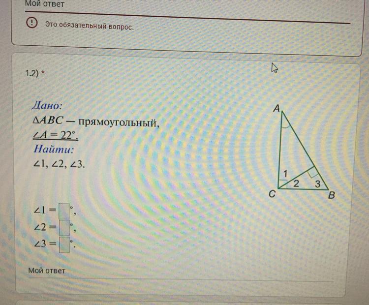 угол 1= 180- (угол А +90) = 180-(22+90)= 68 градусов