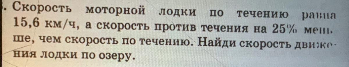 скорость против теч.=15,6-15,6*0,25=11,7 км/ч