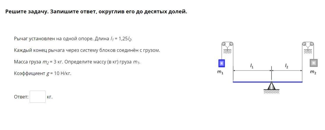 Объяснение: Используем правило рычага (или правило моментов). На рычаг действуют две силы F1 = m1*g, F2 = m2*g. F2/F1 = l1/l2, отсюда F1 = l2/l1 *F2 = 0,8F2 (так как l1 = 1,25*l2). Или m1 = 0,8*m2 = 0,8*3=2,4.