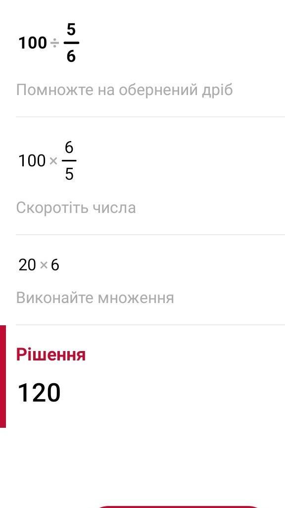 100÷ 5/6 = 100× 6/5 = 20 ×6 = 120