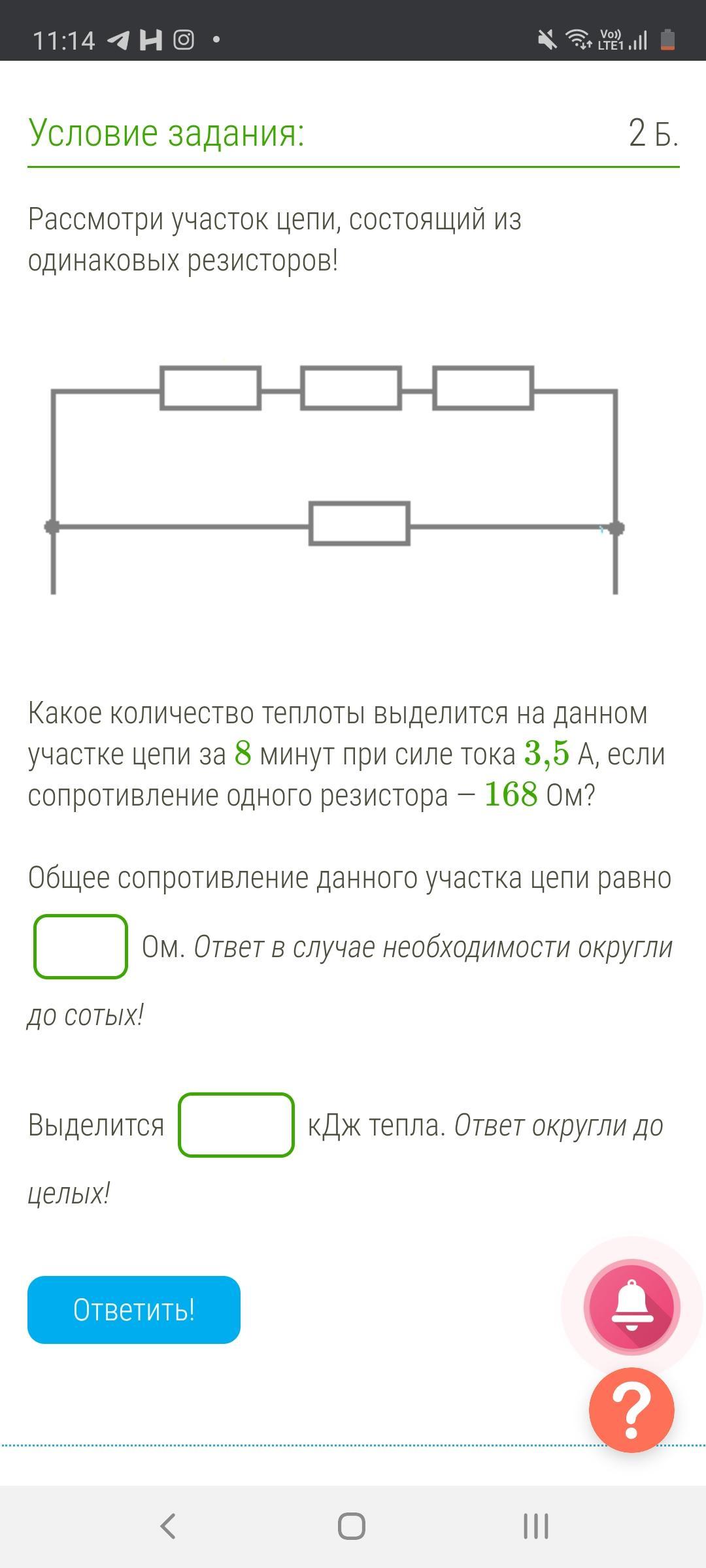 Какое количество теплоты выделится на данном участке цепи за 8 минут при силе тока 3,5 А, если сопротивление одного резистора — 168 Ом?