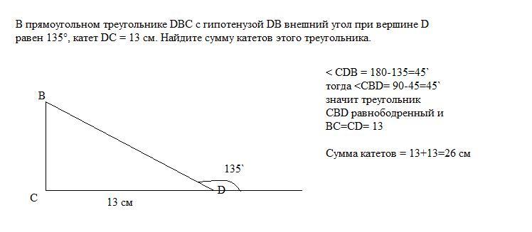 равен 135°, катет DC = 13 см. Найдите сумму