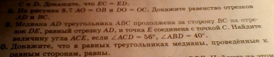 У них СД = ВД, так как медиана делит сторону СВ пополам.АД = ДЕ по условию задачи. Угол АДВ = ЕДС как вертикальные. Значит треуг. АДВ = ЕДС по 1 признаку.