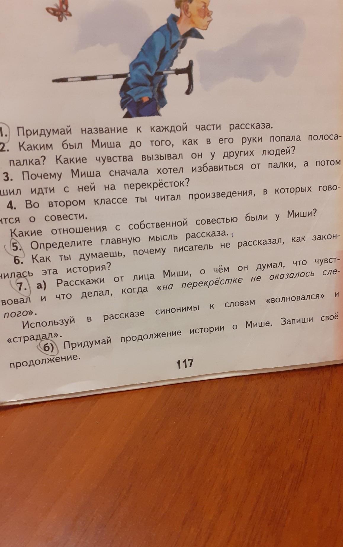 5) Совесть просыпается даже в самом неисправимом хулигане, когда приходит осознание своего поступка и его последствий. Свои ошибки надо уметь исправлять. Когда Мишку ругали другие люди, он не понимал своих ошибок и только собственная совесть и сострадание к слепому беспомощному человеку помогли ему найти правильное решение - вернуть палку.