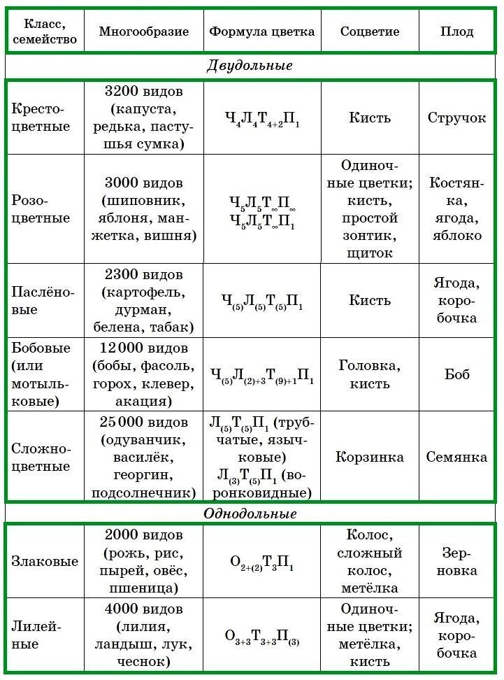 составьте таблицу класса однодольные и двудльные :название семейства,формула цветка,соцветие,плод,примеры растений