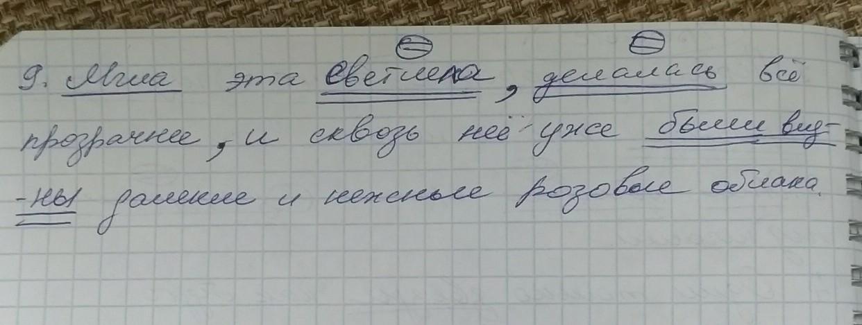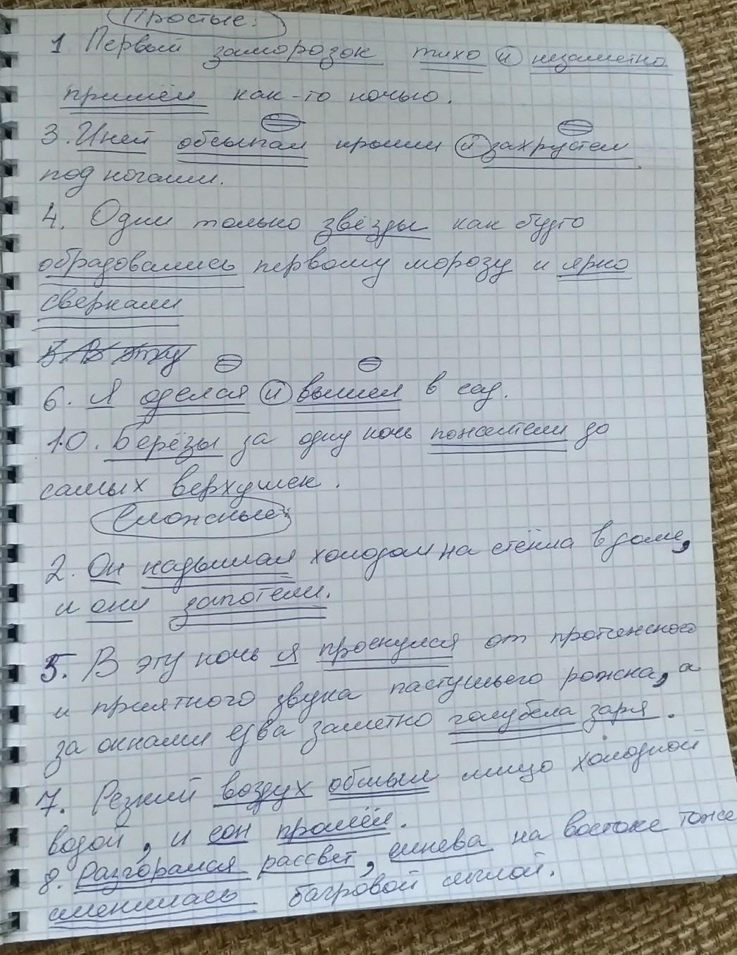 1.Первый заморозок тихо и незаметно пришел как-то ночью. 2.Он надышал холодом на стекла в доме и они запотели. 3.Иней обсыпал крыши и захрустел под ногами. 4.Одни только звезды как будто обрадовались первому морозу и ярко сверкали. 5.В эту ночь я проснулся от протяжного и приятного звука пастушьего рожка а за окнами едва заметно голубела заря. 6. Я оделся и вышел в сад. 7.Резкий воздух обмыл лицо холодной водой и сон прошел. 8.Разгорался рассвет синева на востоке тоже сменилась багровой мглой. 9.Мгла эта светлела делалась всё прозрачнее и сквозь неё уже были видны далёкие и нежные розовые облака. 10.Берёзы за одну эту ночь пожелтели до самых верхушек.