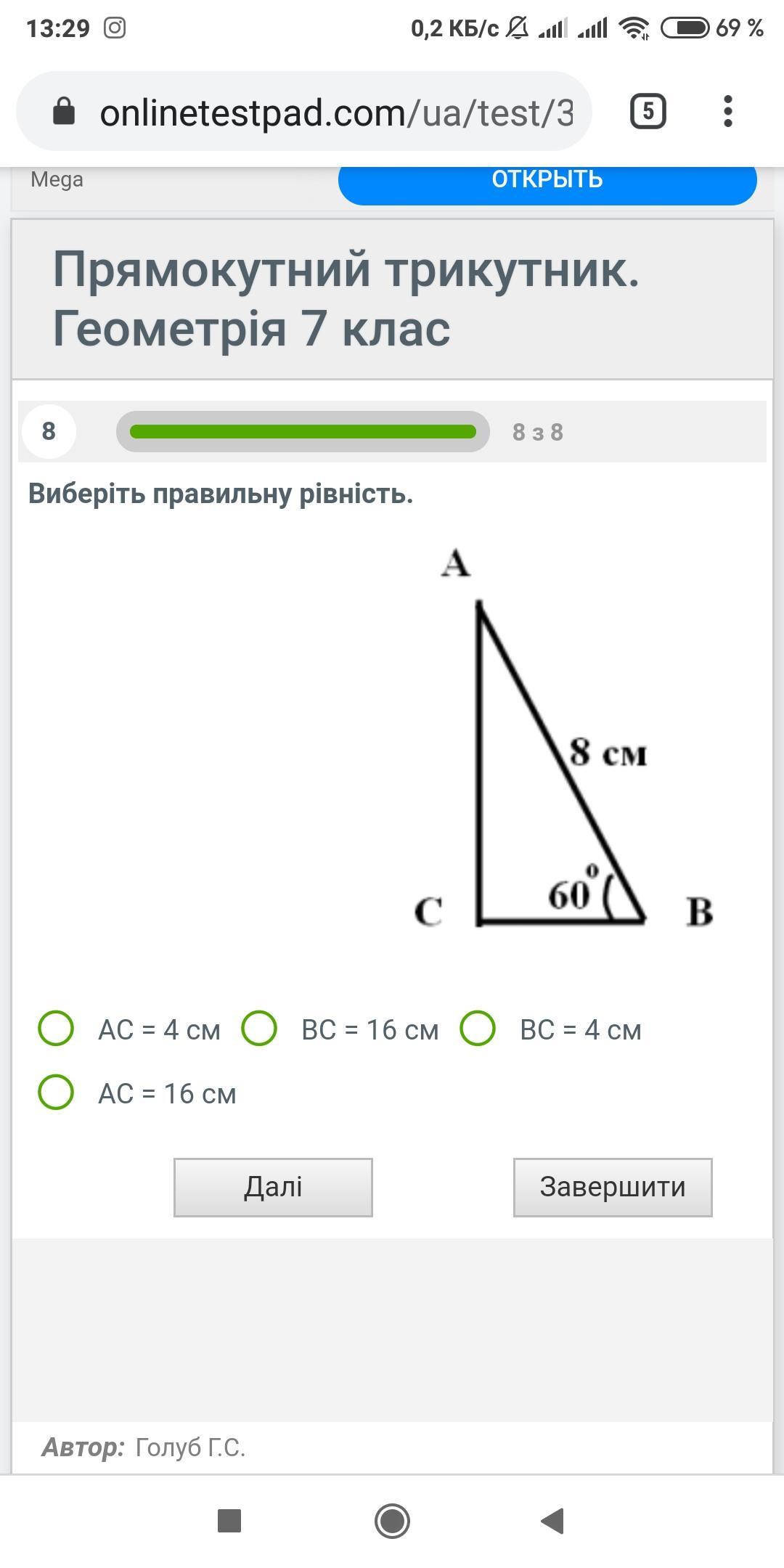 СВ лежит напротив угла ВАС, следовательно СВ = АВ : 2 = 8 : 2 = 4