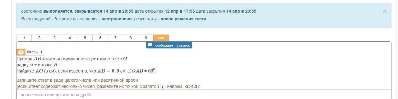 Найдите АО, если известно AB=6.9 угол OAB=60 градусов
