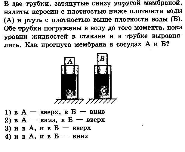 как я думаю то из-за того что в трубке А залит керасин плотностью менше воды значит водв его поднимит,а в трубке Б ртуть каторая плотностью выше воды значит она отпуститься,наверное 1)в А-верх,в Б-вниз