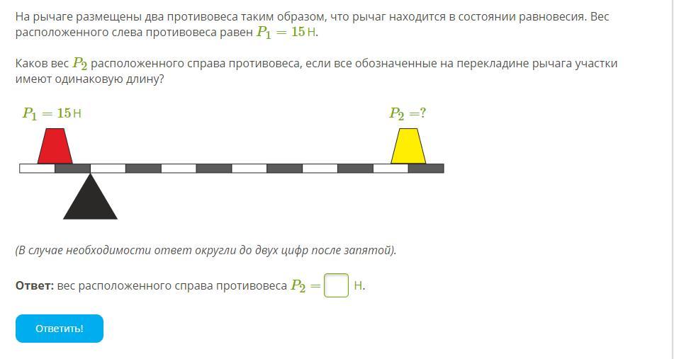 На рычаге размещены два противовеса таким образом, что рычаг находится в состоянии равновесия. Вес расположенного слева противовеса равен P1=15Н.