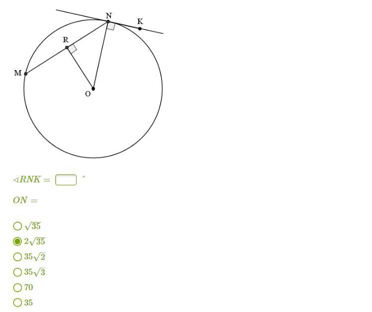 Вычисли угол RNK и радиус окружности, если MN= 70, а ∢RNO=45°