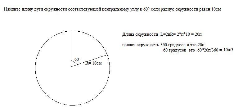 Найдите длину дуги окружности соответсвующей центральному углу в 60° если радиус окружности равен 10см