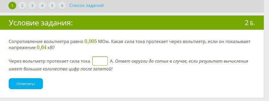 Сопротивление вольтметра равно 0,005 МОм. Какая сила тока протекает через вольтметр, если он показывает напряжение 0,64 кВ?