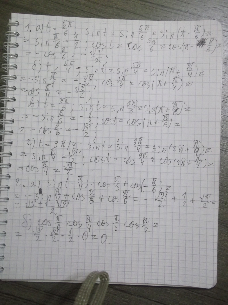 1. Вычислите sin t и cos t, если а) t=5П/6; б) t=5П/4; в) t= 7П/6; г) t= 9П/4.