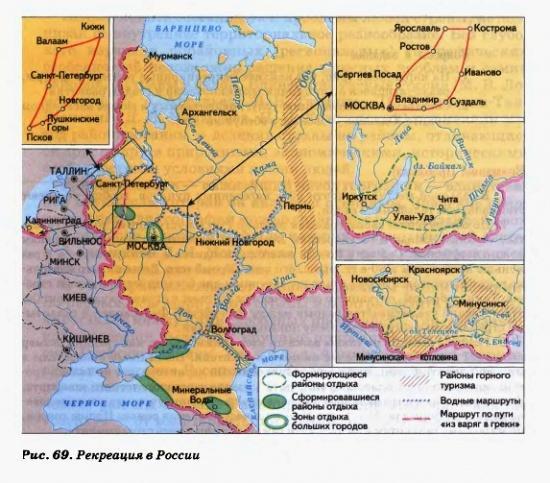На картосхеме (рис, 69) найдите рекреационные районы и центры, различающиеся по причинам возникновения и стадии развития.