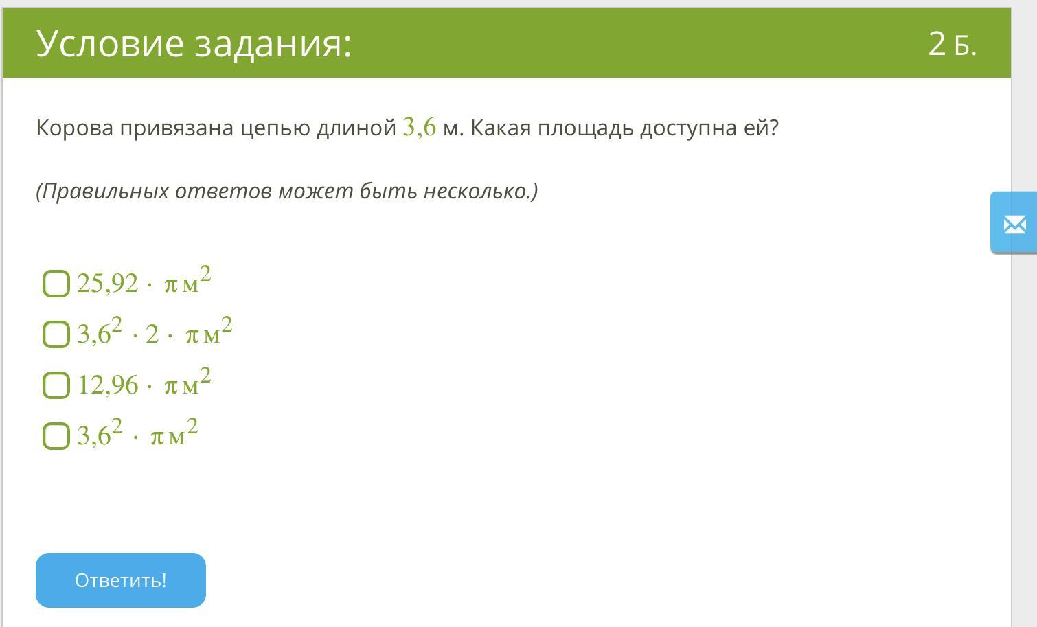 Площадь, которая доступна ей=3,6^2 *π=12,96π