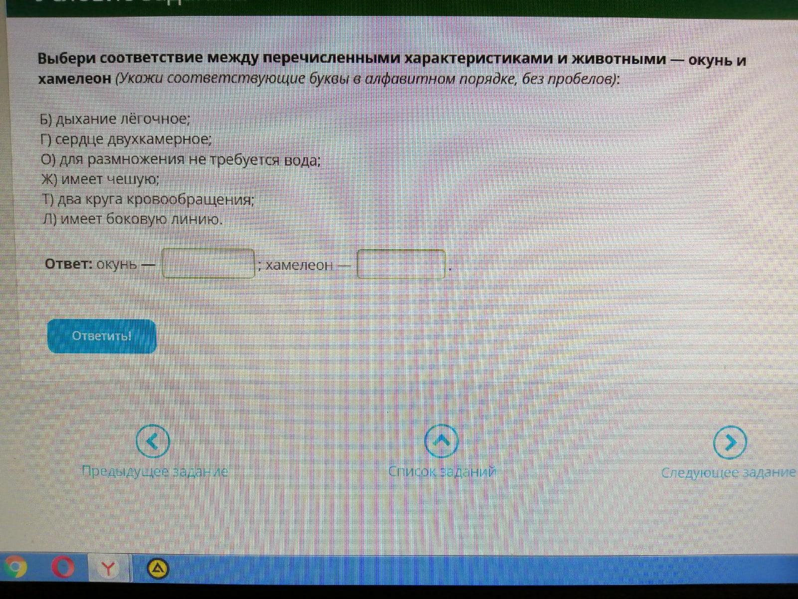 Выбери соответствие между перечисленными характеристиками и животными — окунь и хамелеон (Укажи соответствующие буквы в алфавитном порядке, без пробелов):