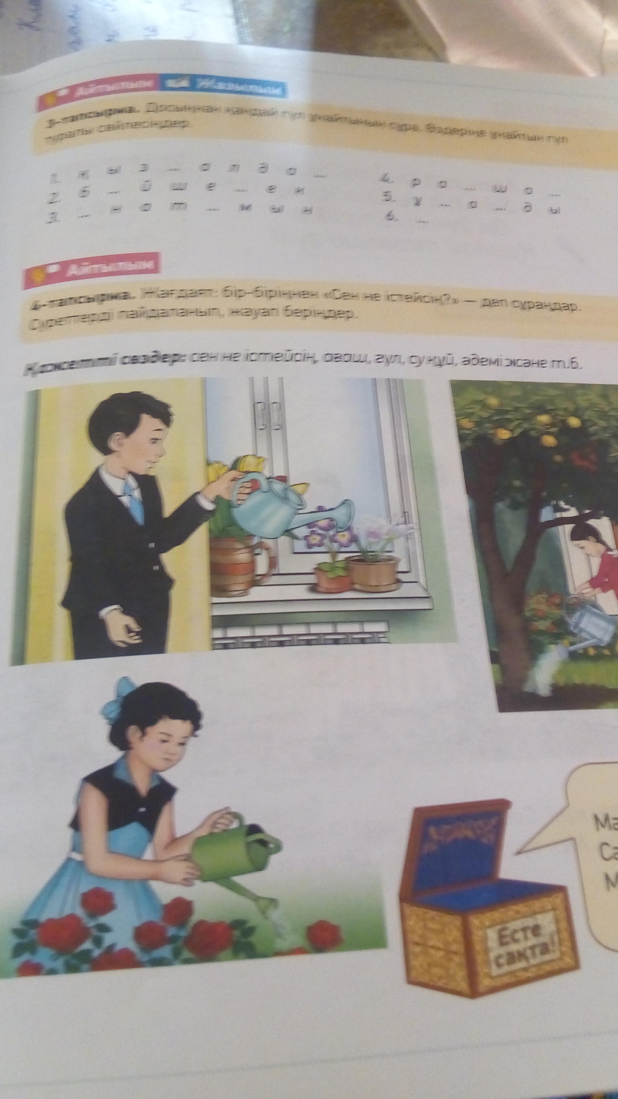 1) Айбар сабақтан келген соң, бөлмесіндегі гүлдерге су құяды.