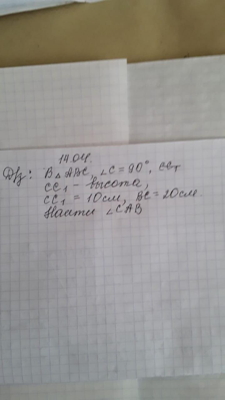 Задача: В ΔABC ∠C = 90°, CC₁ — высота, СС₁ = 10 см, BC = 20 см. Найти ∠CAB.
