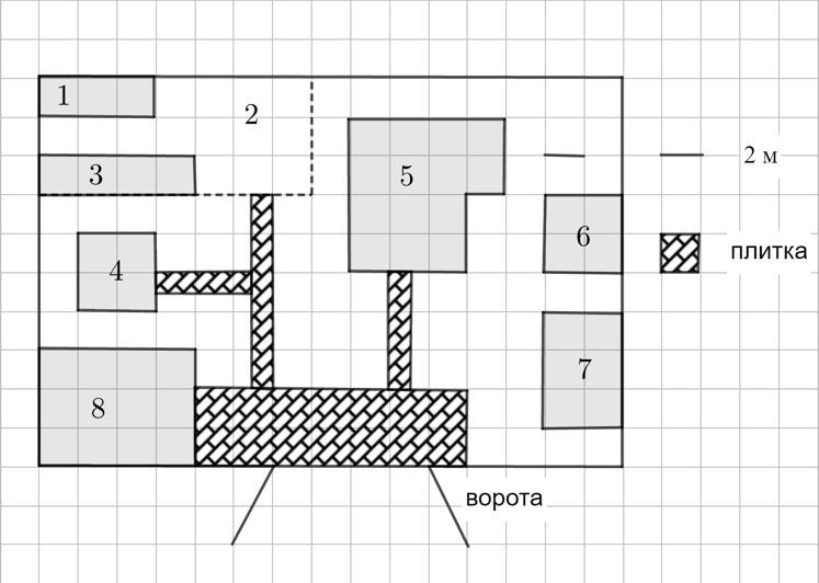 На плане изображено домохозяйство. Сторона каждой клетки на плане равна 2 м. Участок имеет форму прямоугольника. Выезд и въезд осуществляются через единственные ворота. При входе на участок слева от ворот находится коровник, а справа — курятник. Площадь, занятая курятником, равна 24