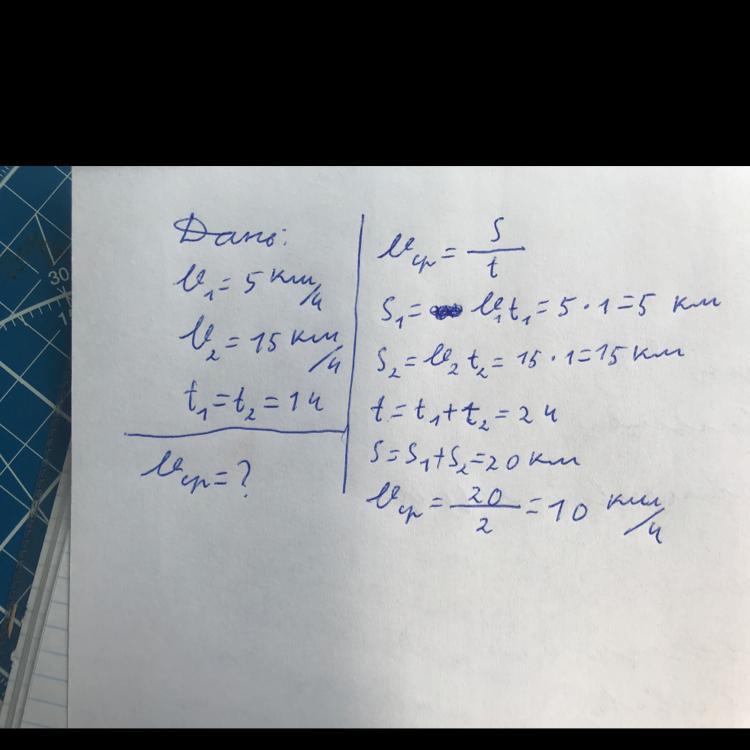 Турист час двигался со скоростью 5 км/час, а потом час ехал со скоростью 15 км/час. Вычислить среднюю скорость на всем пути?
