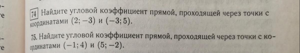 Найти угловой коэффициент прямой, проходящей через точки с координатами (2; −3) и (−3; 5).