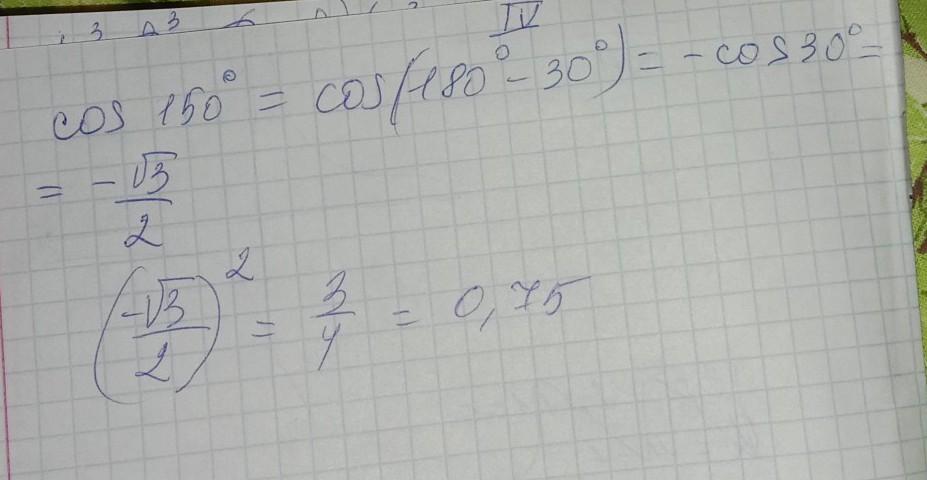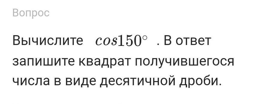 СРОЧНО!!! Вычислите cos 150°.В ответ запишите квадрат получившегося числа в виде десятичной дроби.