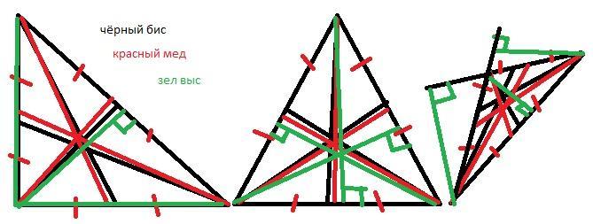 легко же:бис это луч делющий угол пополам, мед это луч из вершину угла проходящий через середину противолеж. стороны, а высота это перпендикуляр.