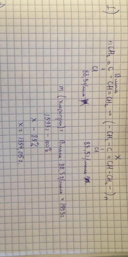 Хлоропрен (2-хлор-бутадиен-1,3) легко полимеризуется, образуя хлоропреновый каучук. Напишите схему полимеризации хлоропрена. Определите массу полимера полученного из 18 моль хлоропрена с выходом 85%
