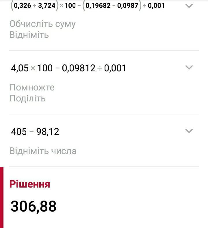 (0,326+3,724)×100-(0,19682-0,0987)÷0,001=306,88