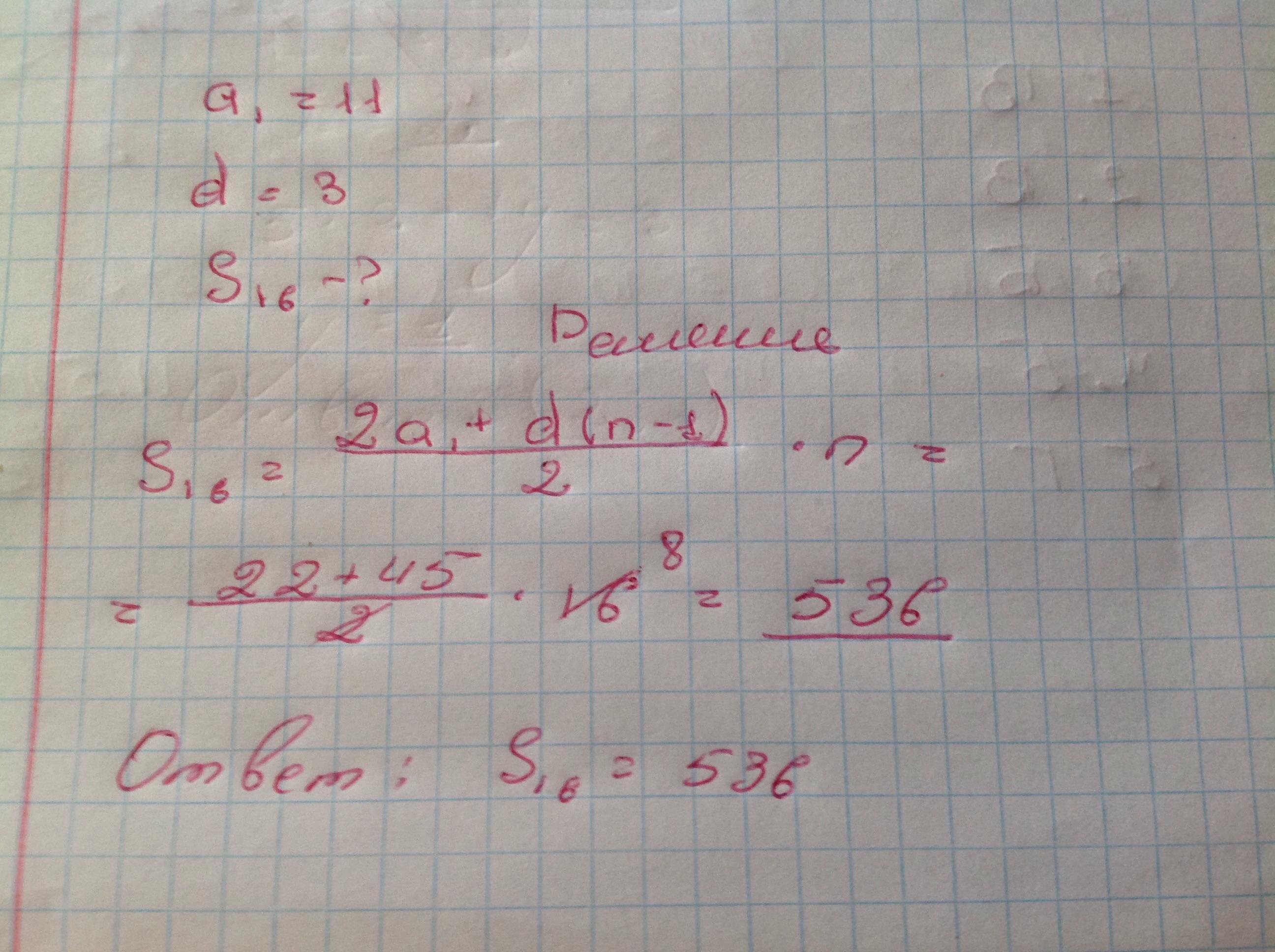 a1=11; S16= (2a1 + d(n-1)): 2 * n= (22+45): 2 * 16= 67 * 8= 536