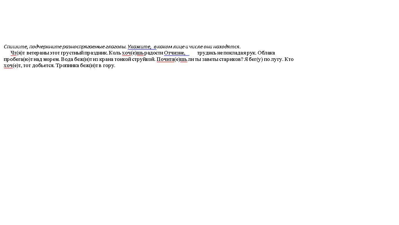 Чтят (3 лицо, мн. число) ветераны этот грустный праздник. Коль хочешь ( 2 лицо, ед. число) радости Отчизне, трудись не покладая рук. Облака пробегают (3 лицо, мн. число) над морем. Вода бежит (3 лицо, ед. число) из крана тонкой струйкой. Почитаешь (2 л, ед. ч) ли ты завеы стариков? я бегу по лугу (1 л, ед ч). кто хочет (3 л, ед ч) , тот добьётся. Тропинка бежит (3л, ед ч) в гору.