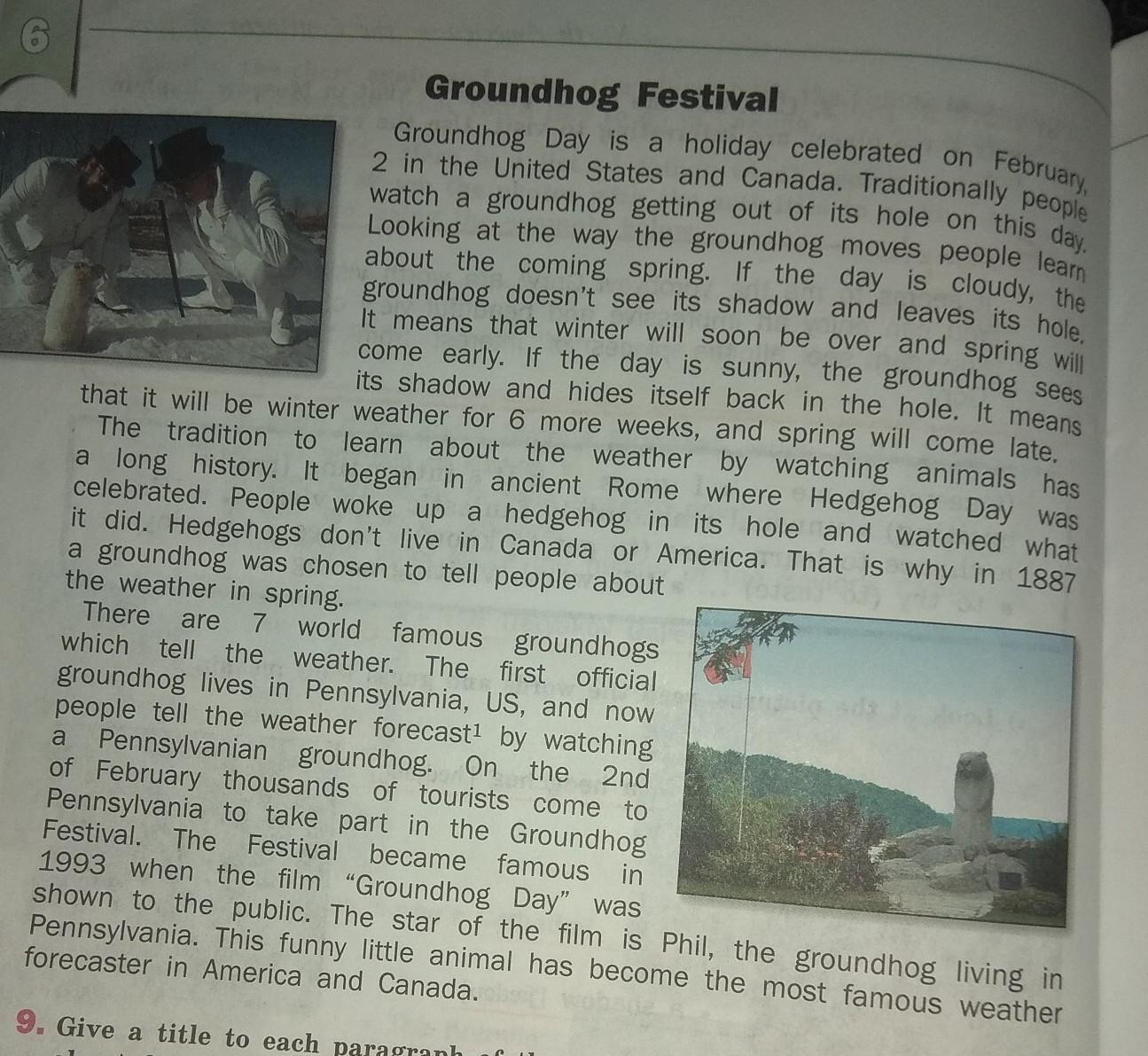 Фестиваль сурка День сурка - праздник, отмечаемый 2 февраля в США и Канаде. Традиционно пеон наблюдает, как сурок вылезает из своего отверстия на этом да. Глядя на то, как сурок движется, люди узнают о предстоящей весне. Если день тихий, сурок не видит своей тени и покидает свою нору. Это значит, приходи рано. Если день солнечный, сурок видит свою тень и прячется обратно в нору. Это значит, что зима скоро закончится, а весна будет еще зимой на 6 недель, а весна придет поздно. Традиция узнавать о погоде, наблюдая за животными, имеет давнюю историю. Это началось в древнем Риме, где отмечался День Ежика. Люди просыпали ежа в его норе и наблюдали за тем, что он делал. Ежики не живут в Канаде или Америке. Вот почему в 1887 году сурок был выбран, чтобы рассказать людям о погоде весной. Есть 7 всемирно известных сурков, которые сообщают погоду. Первый официальный сурок живет в Пенсильвании, США, и теперь люди сообщают прогноз погоды, наблюдая за сеньоном из Пенсильвании. 2 февраля тысячи туристов приезжают в Пенсильванию, чтобы принять участие в фестивале сурка. Фестиваль прославился в 1993 году, когда фильм «День сурка» был показан публике. Звезда фильма - Фил, сурок, живущий в Пенсильвании. Этот забавный зверёк стал самым известным синоптиком в Америке и Канаде.