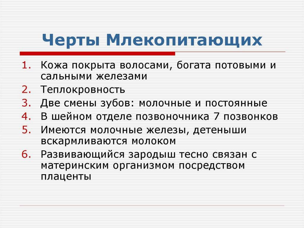 Какие особенности строения отличают представителей класса Млекопитающие от всех остальных хордовых? (В ответе укажите не менее 4х признаков)