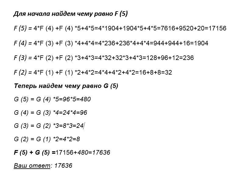 Алгорит вычисления значений функций F(n) и G(n),где n -натуральное число,задан следующими соотношениями: