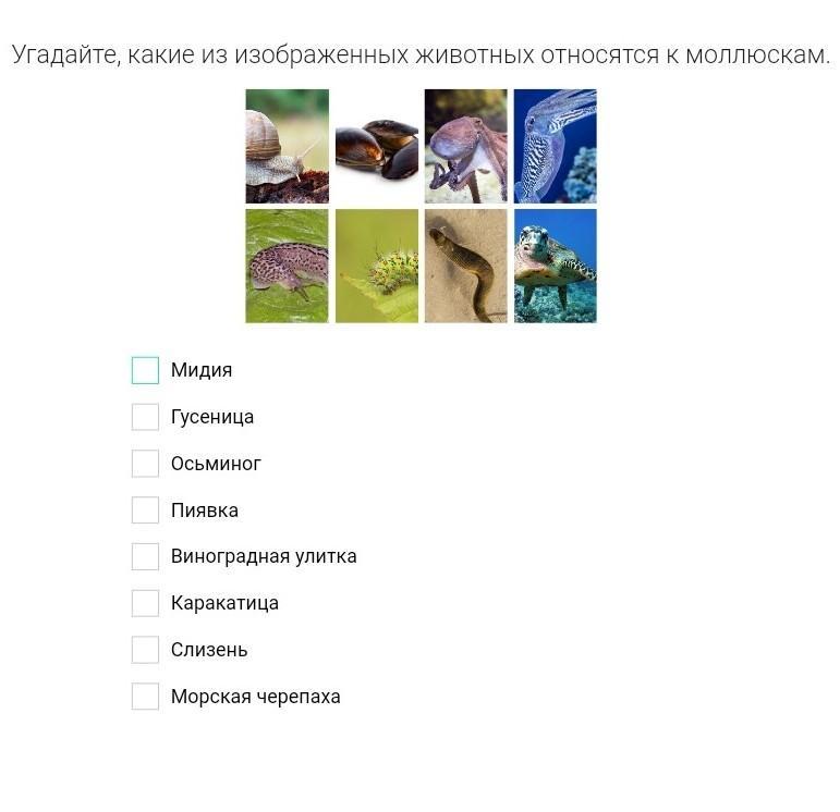 Ответ: мидия, осьминог, виноградная улитка, каракатица, слизень.