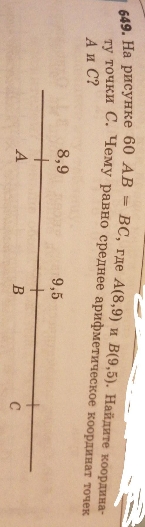 о на рисунке 60 AB = BC, где А(8,9) и В(9,5). Найдите координату точки с. Чему равно среднее арифметическое координат точек