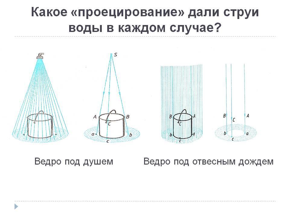 Ведро под душем соответствует центральному проецированию, а ведро под отвесным дождём соответствует прямоугольному проецированию, которое является частным случаем параллельного проецирования.