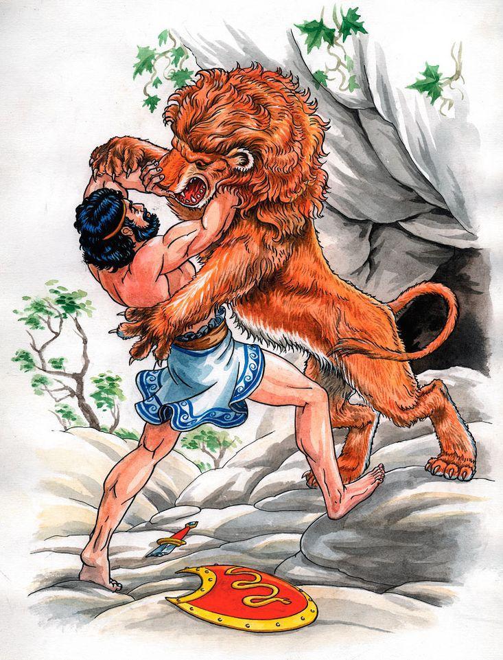 Верный друг Геракла, сын Ификла, Иолай, дожидался героя у ворот дворца; но Геракл попросил его остаться в Микенах и пошел совершать свой первый подвиг один. Крестьяне соседних мест взмолились к нему, как к своему освободителю; он приказал им готовить жертву Зевсу-Спасителю и пошел дальше к указанной ему роще. Вскоре рычание зверя указало ему путь – и еще через некоторое время Немейский лев сам вышел к Гераклу навстречу, гневно бичуя свои бока своим могучим хвостом. Львы были тогда редкостью в Греции – потом они и совсем перевелись – но этот был из породы чудовищ, взлелеянных гигантами для решающей битвы с богами.