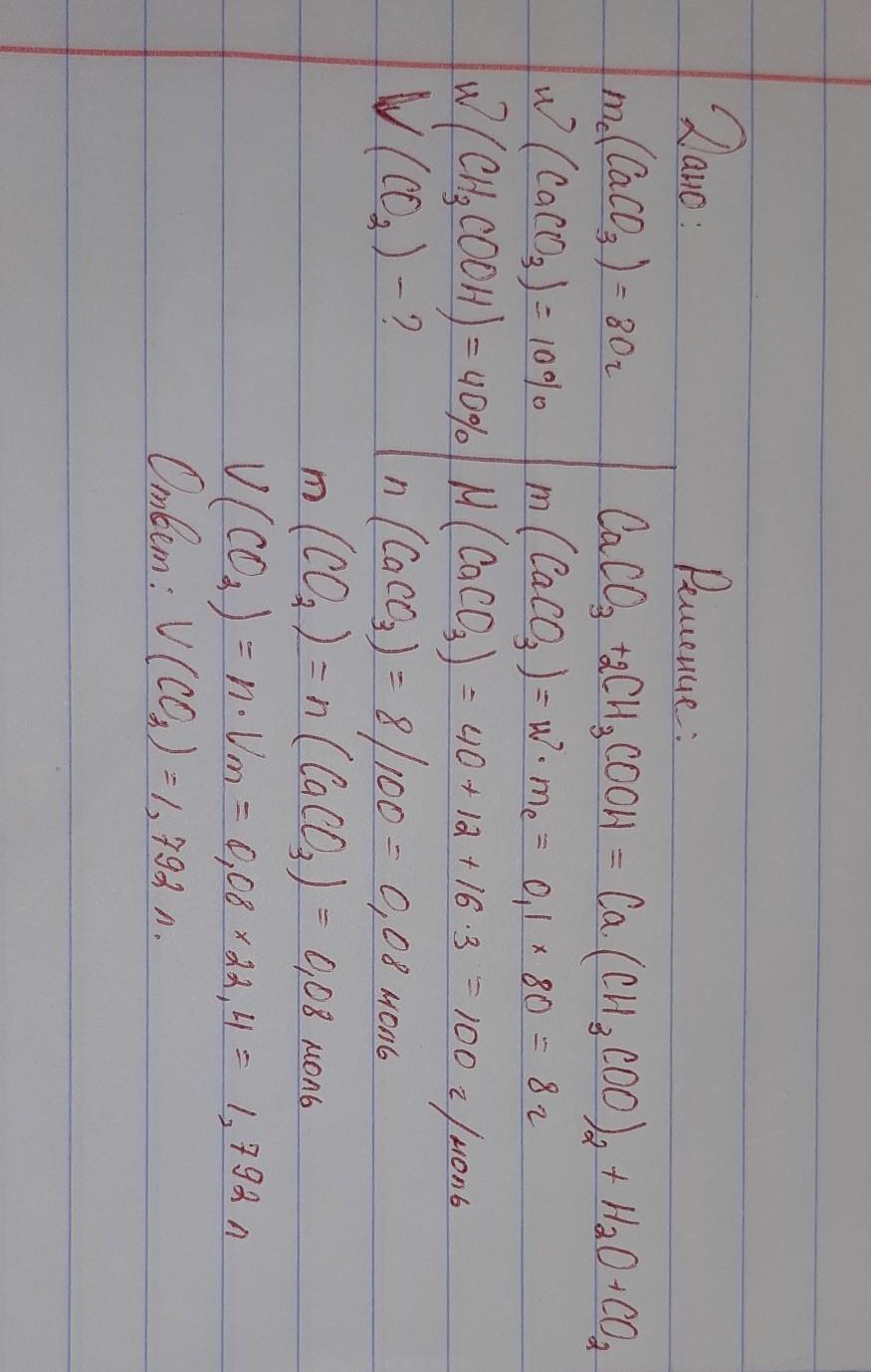 Вапняк масою 80 г з масовою часткою 10% подіяли розчином оцтової кислоти 40%. Який об‘єм вуглекислого газу н.у. отримали при цьому? Help pls!!
