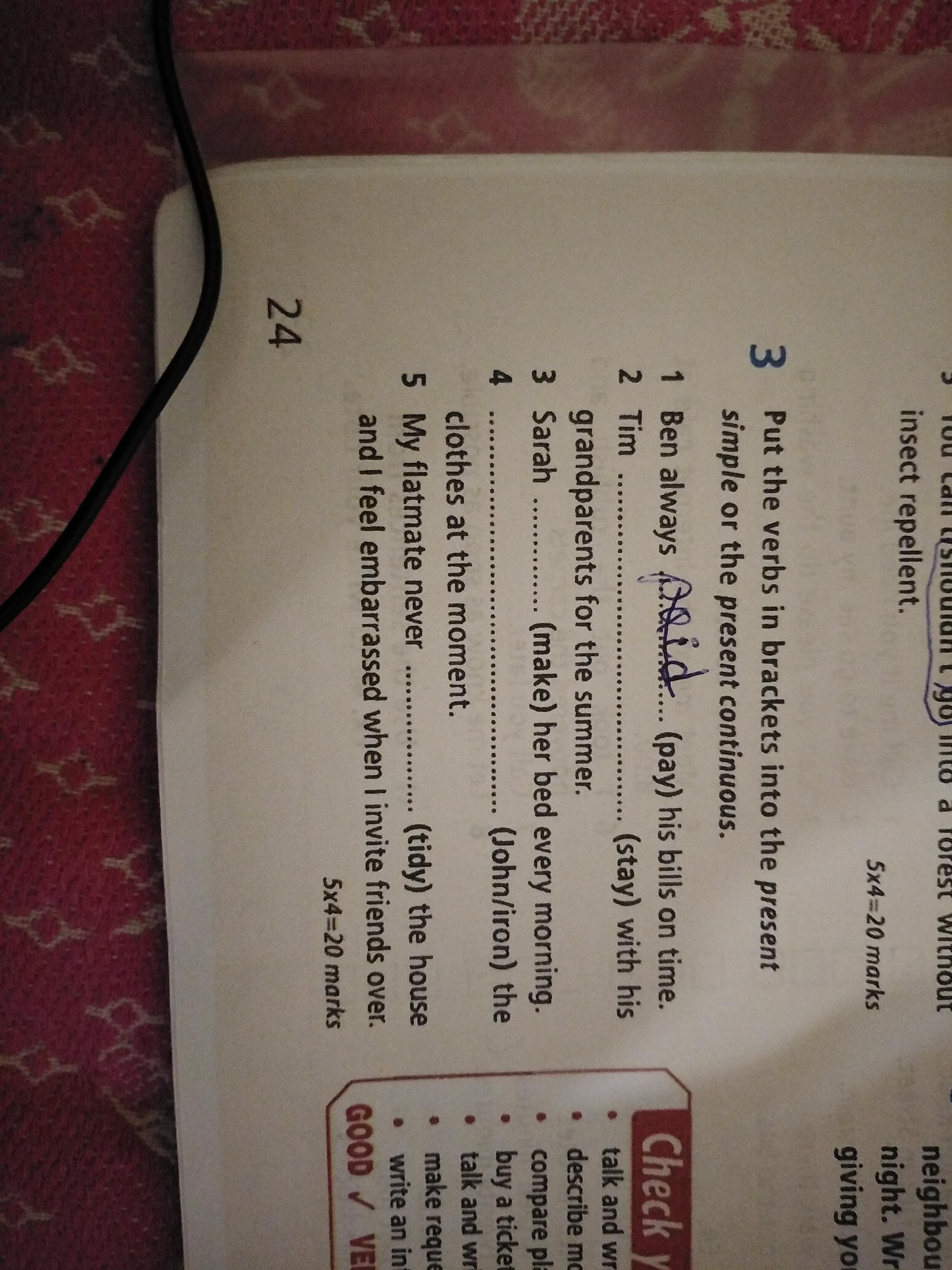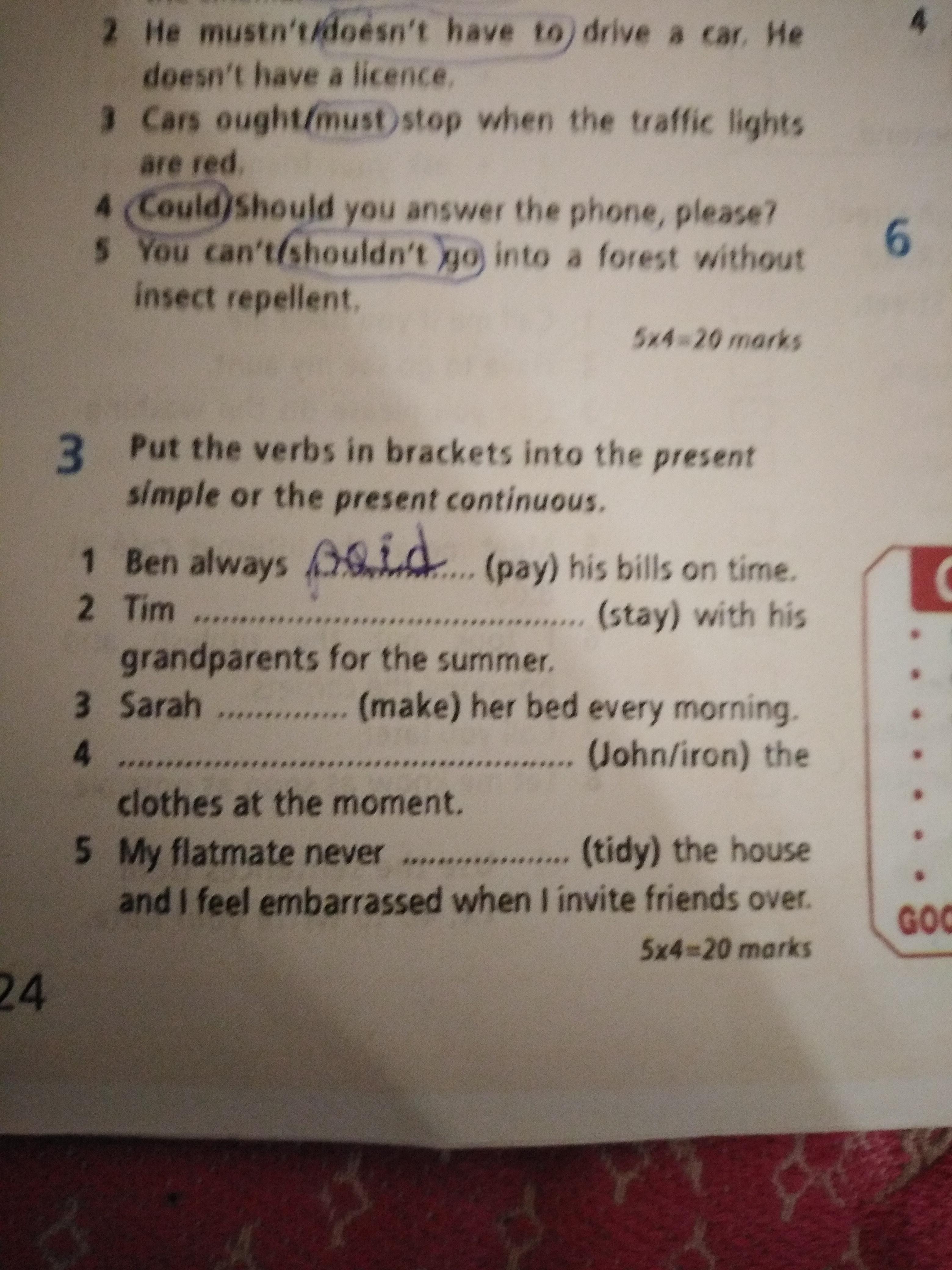 Put the verbs in brackets into the present simple or the present continuous pay, stay, make, John/iron, tidy. Плиз, помогите, срочно