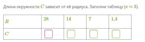 Длина окружности C зависит от её радиуса. Заполни таблицу (π ≈ 3).