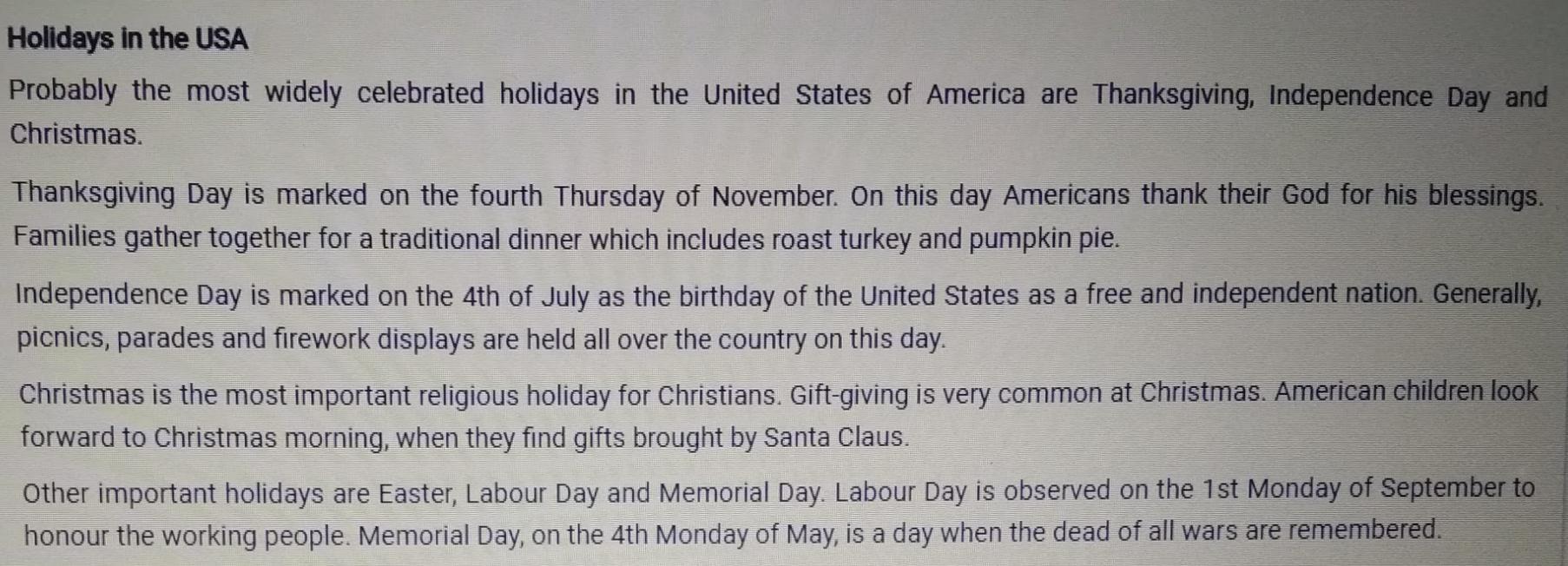Праздники в США. Вероятно, наиболее широко празднуемые праздники в Соединенных Штатах Америки - День Благодарения, День Независимости и Рождество.