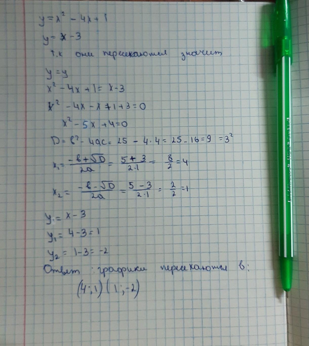 найдите координаты всех точек пересечения параболы y=x^2-4x+1 и прямой y=x-3 не выполняя построение графика